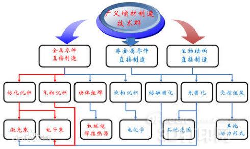 关桥院士提出了“广义”和“狭义”增材制造的概念(如图所示),“狭义”的增材制造是指不同的能量源与CAD/CAM技术结合、分层累加材料的技术体系;而“广义”增材制造则以材料累加为基本特征,以直接制造零件为目标的大范畴技术群。如果按照加工材料的类型和方式分类,又可以分为金属成形、非金属成形、生物材料成形等(如图所示)。